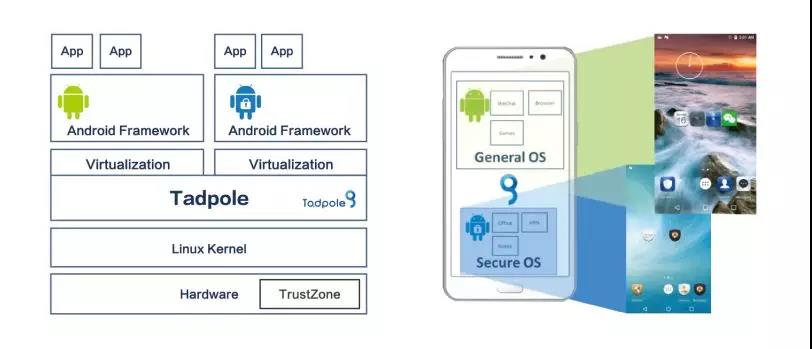 基于系統虛擬化技術,在單一核心下執行兩個完整的Android系統。每一個Android系統皆具備完整的執行功能并且兼容于第三方軟件。兩個Android系統互不依賴,完全獨立。當Tadpole系統啟動后,可視需求或環境狀況只啟動任一系統,也可以據實際狀況完全關閉任一系統。例如在極機密環境中,公開日常系統 (Public/General OS) 就完全關閉,而不僅是隱藏在背景執行。