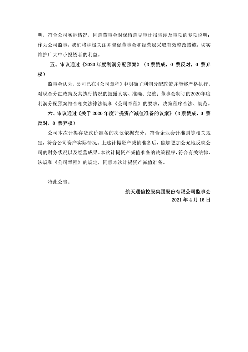 航天通信控股集團股份有限公司八屆十四次監事會決議公告