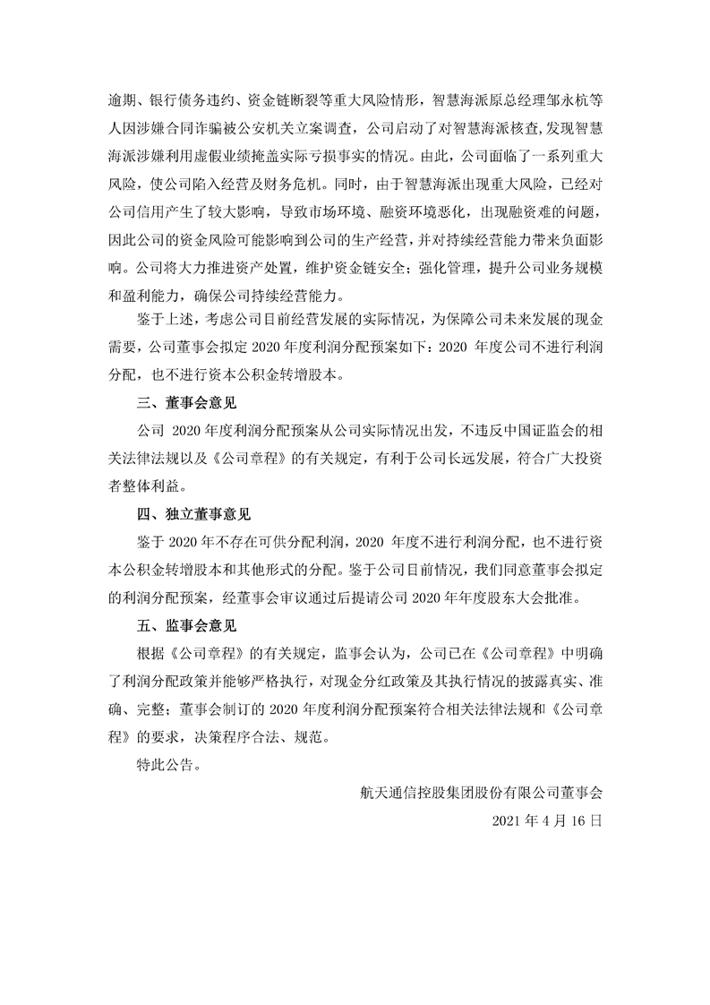 航天通信控股集團(tuán)股份有限公司關(guān)于2020年度擬不進(jìn)行利潤(rùn)分配的公告