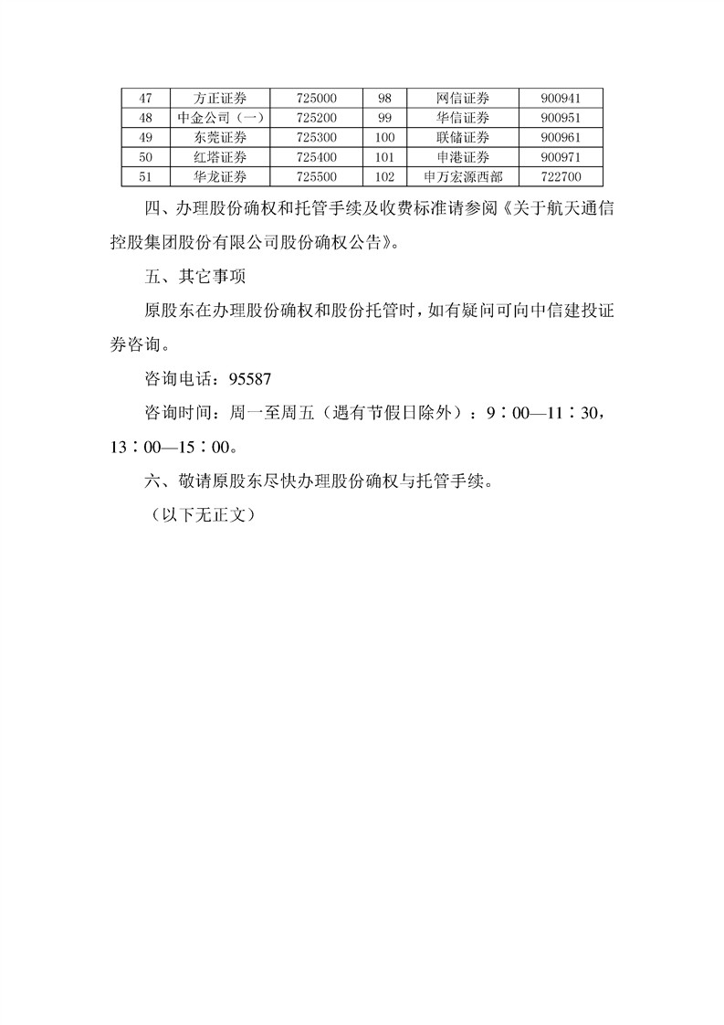 關(guān)于航天通信控股集團(tuán)股份有限公司原流通股股東股份確權(quán)和托管的催示公告