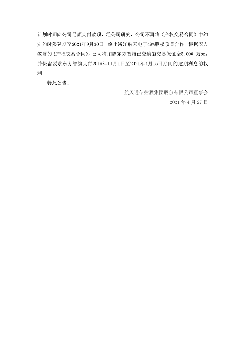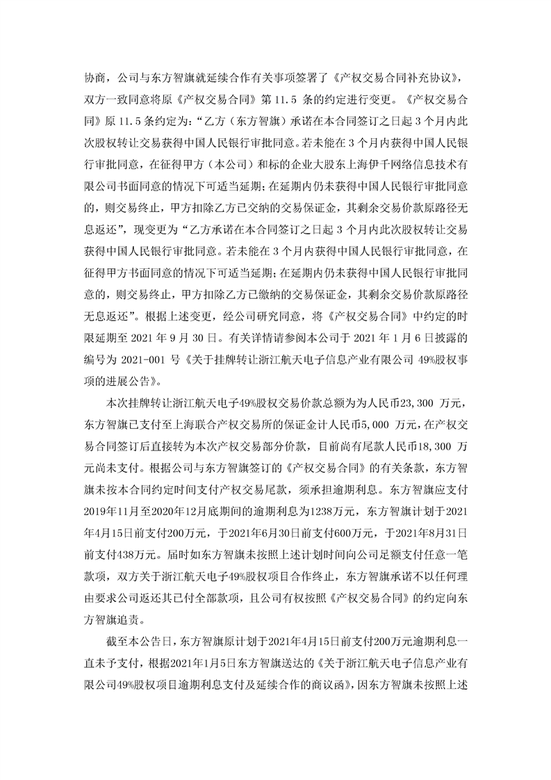航天通信關于掛牌轉讓浙江航天電子信息產業有限公司49%股權事項的進展公告